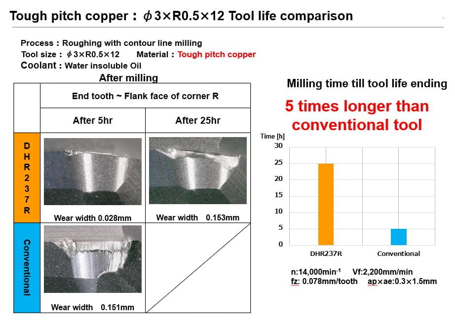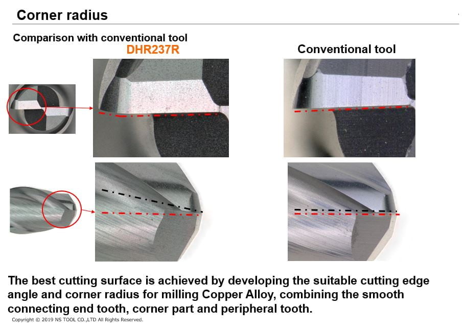 The best cutting surface is achieved by developing the suitable cutting edge angle and corner radius for milling Copper Alloy, combining the smooth connecting end tooth, corner part and peripheral tooth.